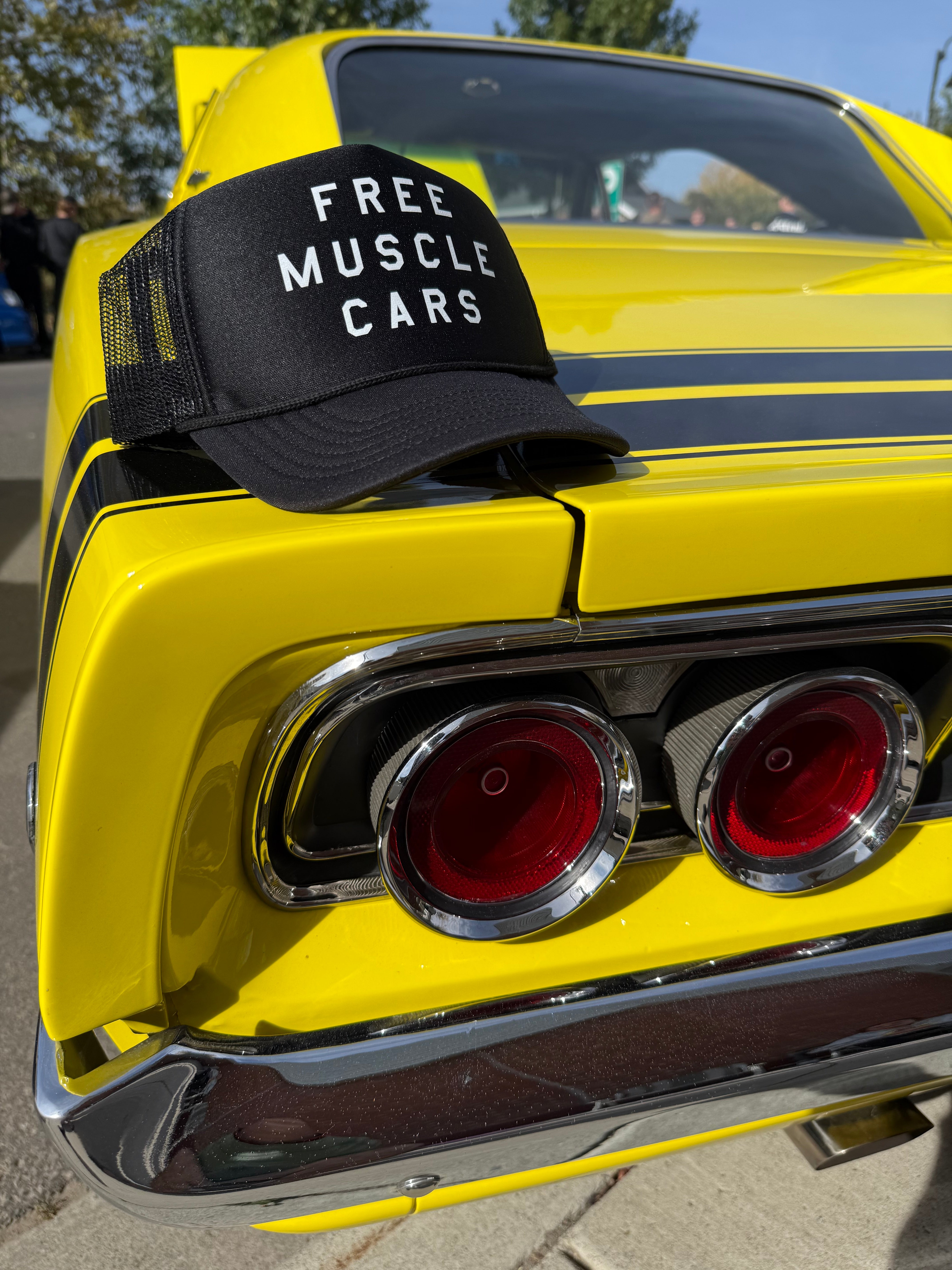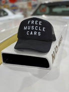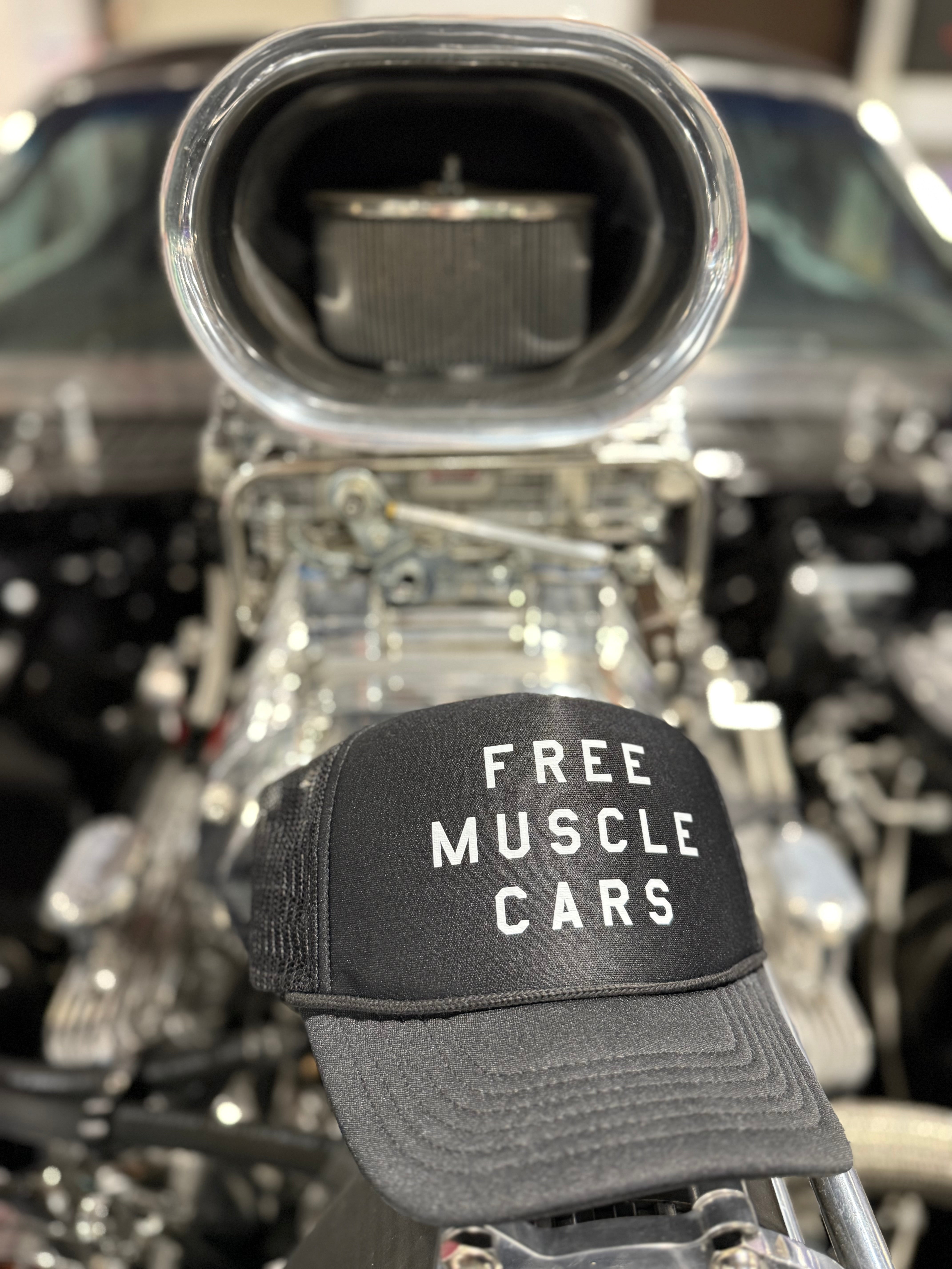 A super retro hat FREE MUSCLE CARS represents the days of muscle cars and drag strips. There was a time not long ago when high horse power muscle cars ruled the streets and reeked havoc. This one is super 70s with its bold lettering and nostalgic look