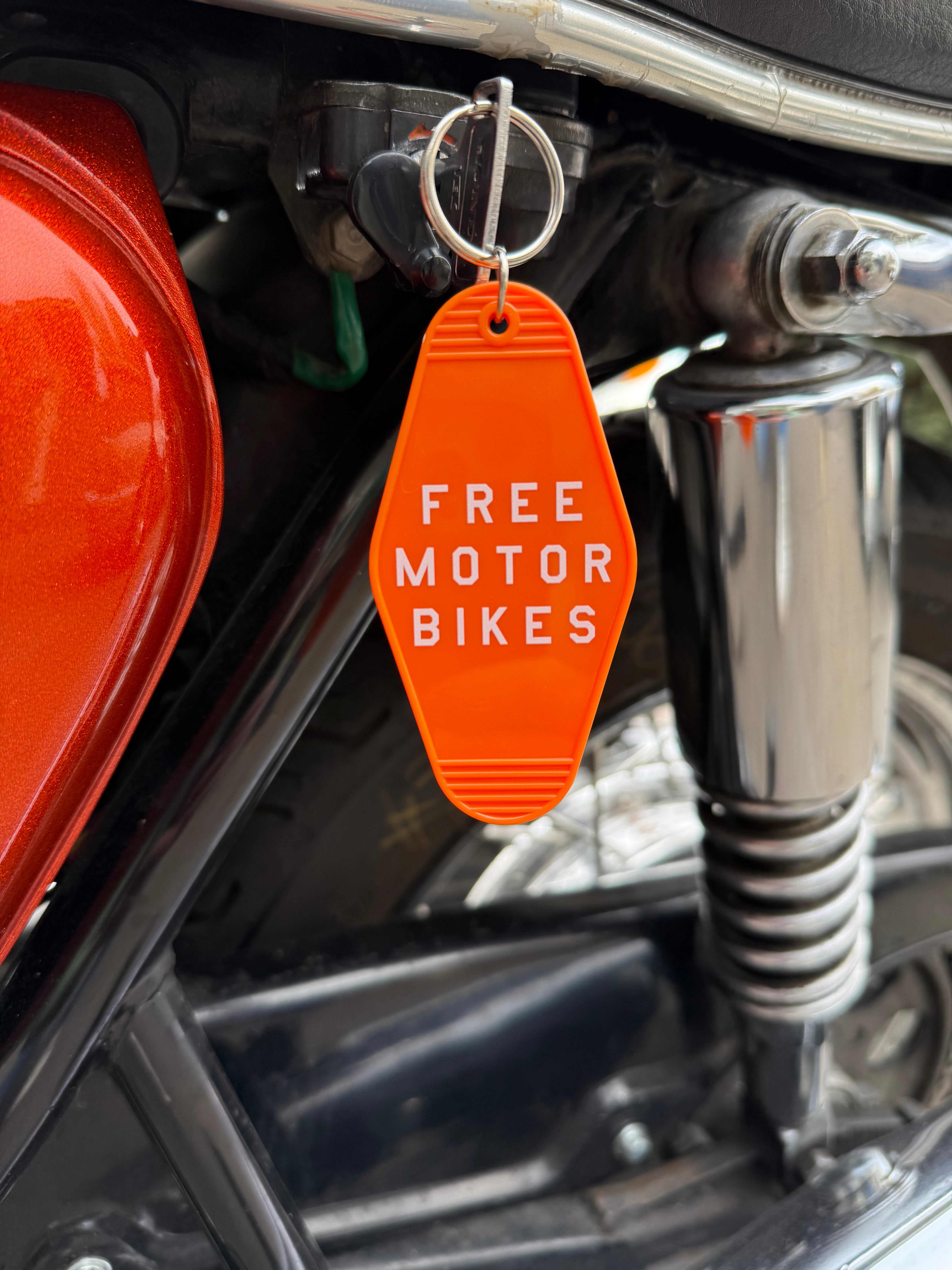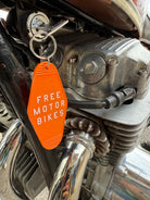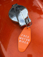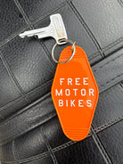 A super retro motorbike keychain FREE MOTOR BIKES in retro orange with white lettering. Free Motor Bikes represents the feeling of starting up your bike and getting some well needed throttle therapy. It’s never too late to get your motorbike license and hit the open roads full throttle!