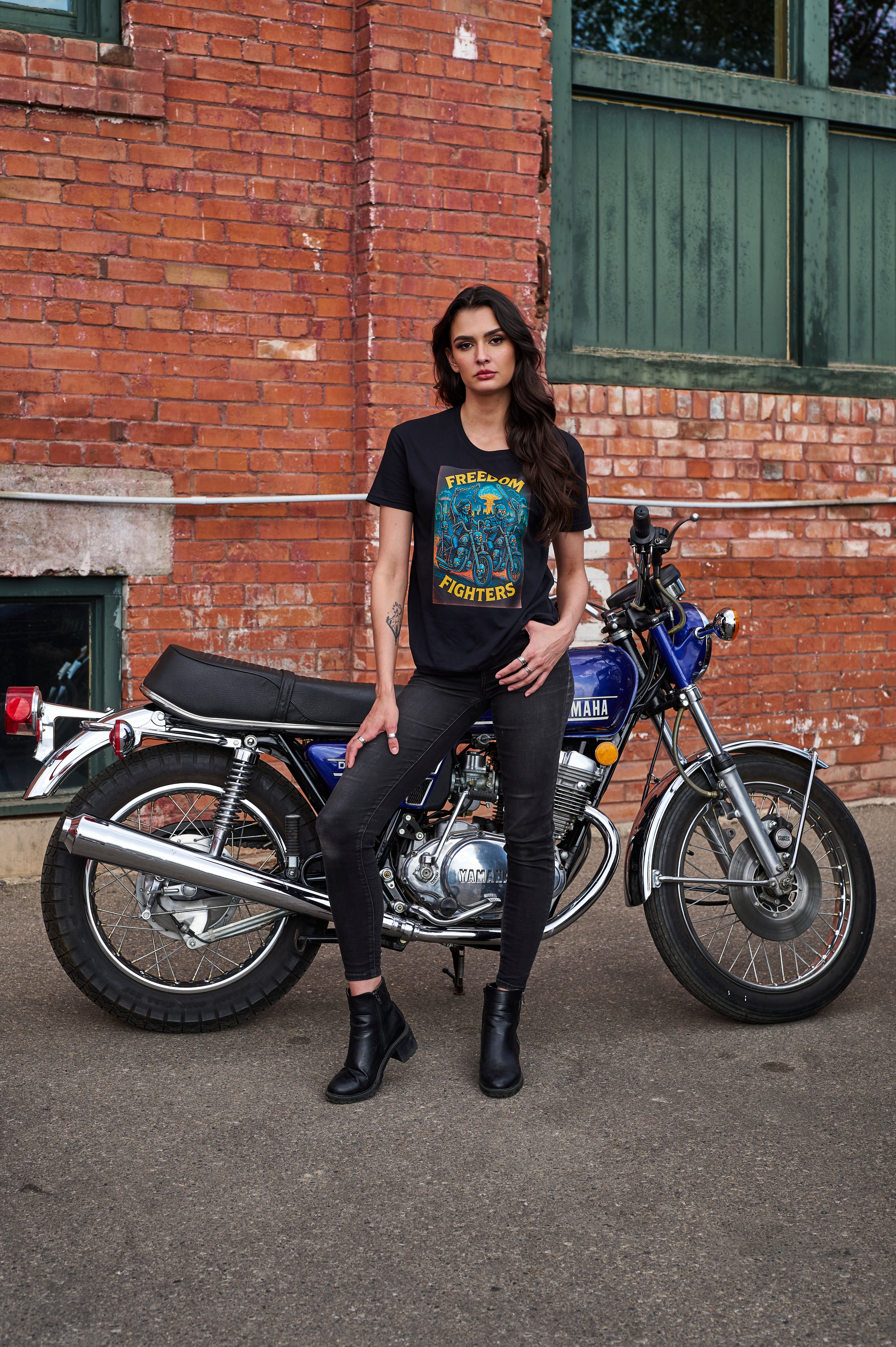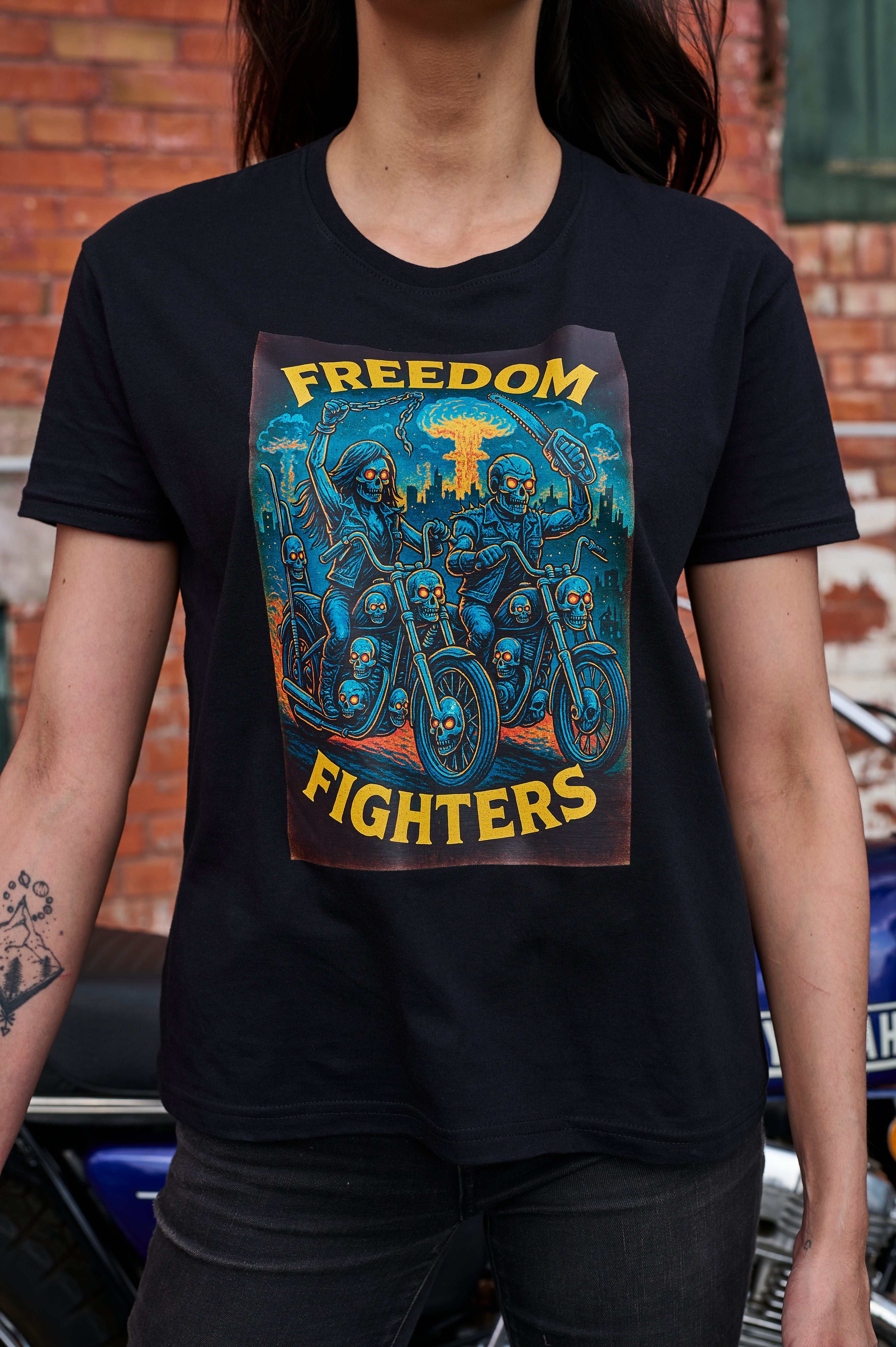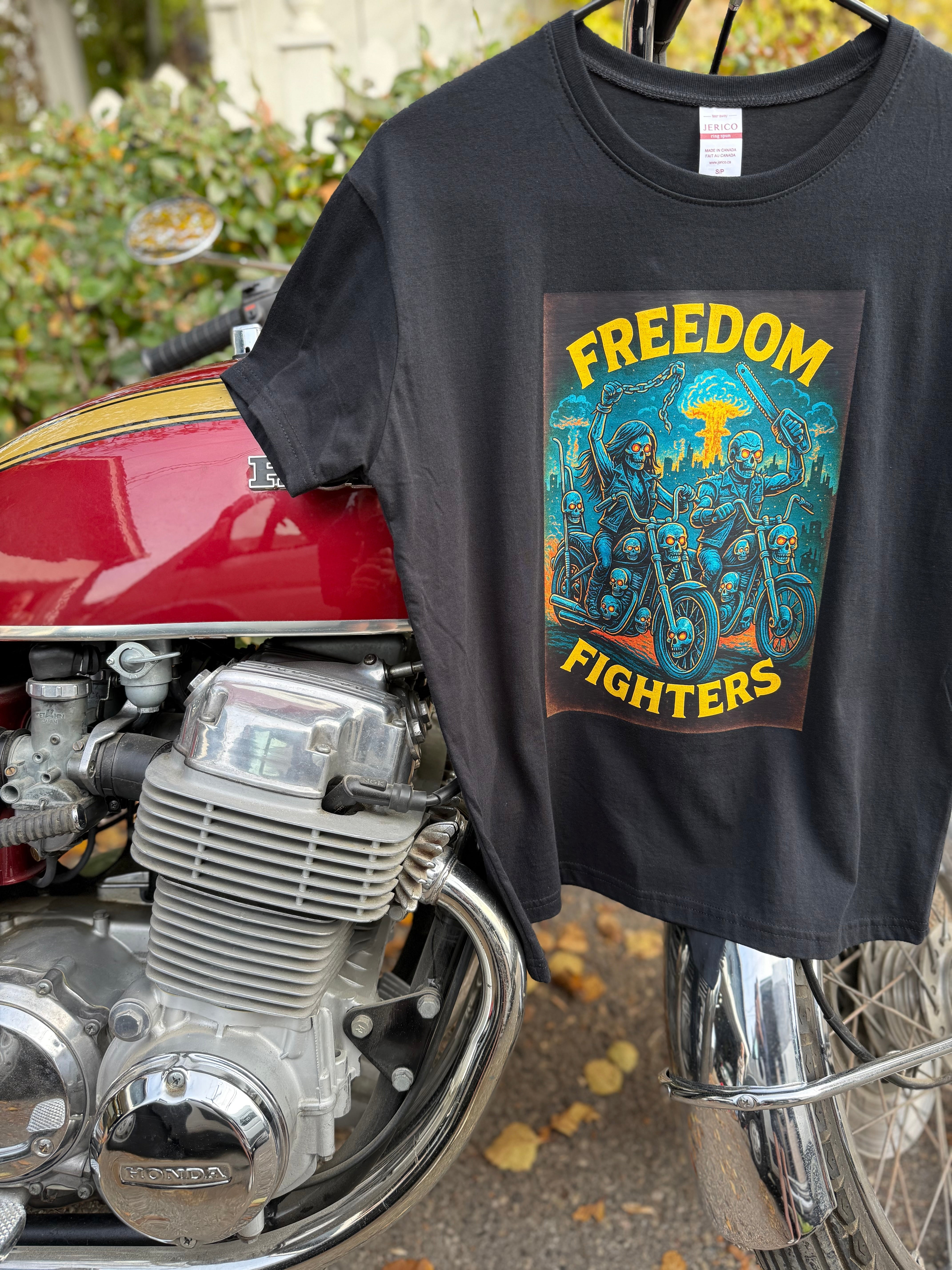 A super retro motorbike tee FREEDOM FIGHTERS represents fighting for what you believe in and fighting against evil. This one is super 80's with its vibrant colors and explosive background. Its never to late to get your motorbike license and hit the open roads full throttle!