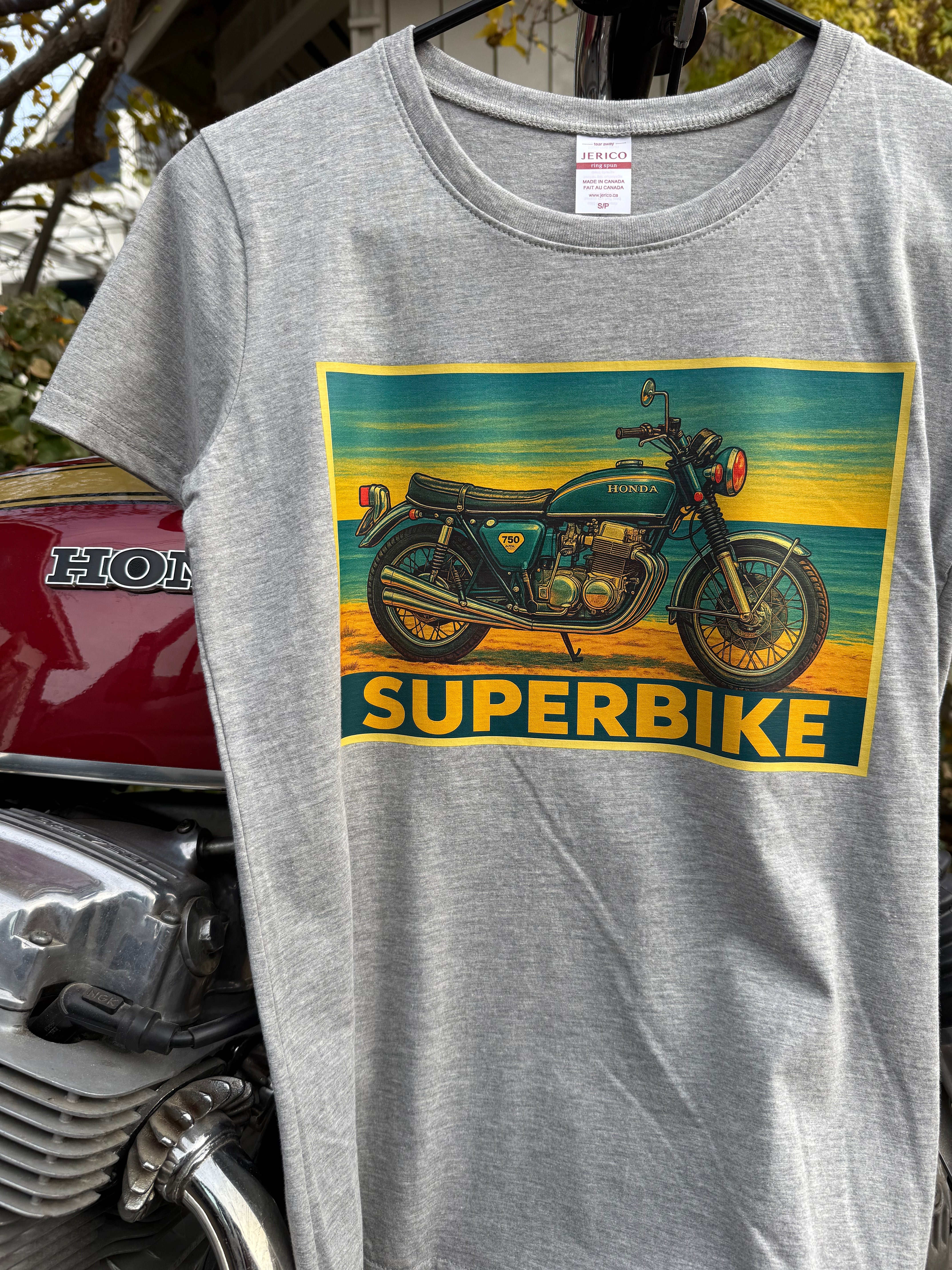 A super retro throwback tee SUPERBIKE represents what some call the first true superbike, the 1969 Honda CB 750 FOUR sandcast. These iconic Honda CB750s remain highly collectable today and have a huge following.