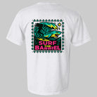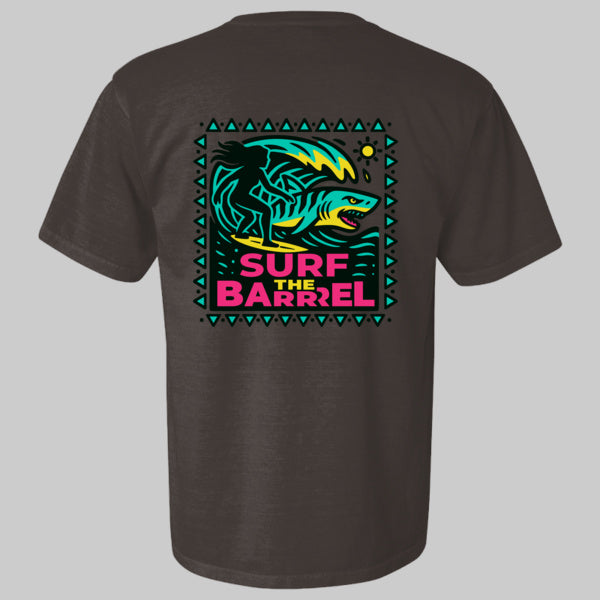 A super retro throwback tee SURF THE BARRREL represents the gnarliest of the BIG wave surfer scene! Inspired by Peʻahi, more commonly known as Jaws, the world-famous big wave surf break on the north shore of Maui Hawaii. By the late 1990s and early 2000s, Jaws had become the center of the big wave surfing world with only the top elite having conquered and survived!