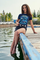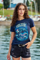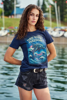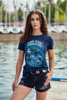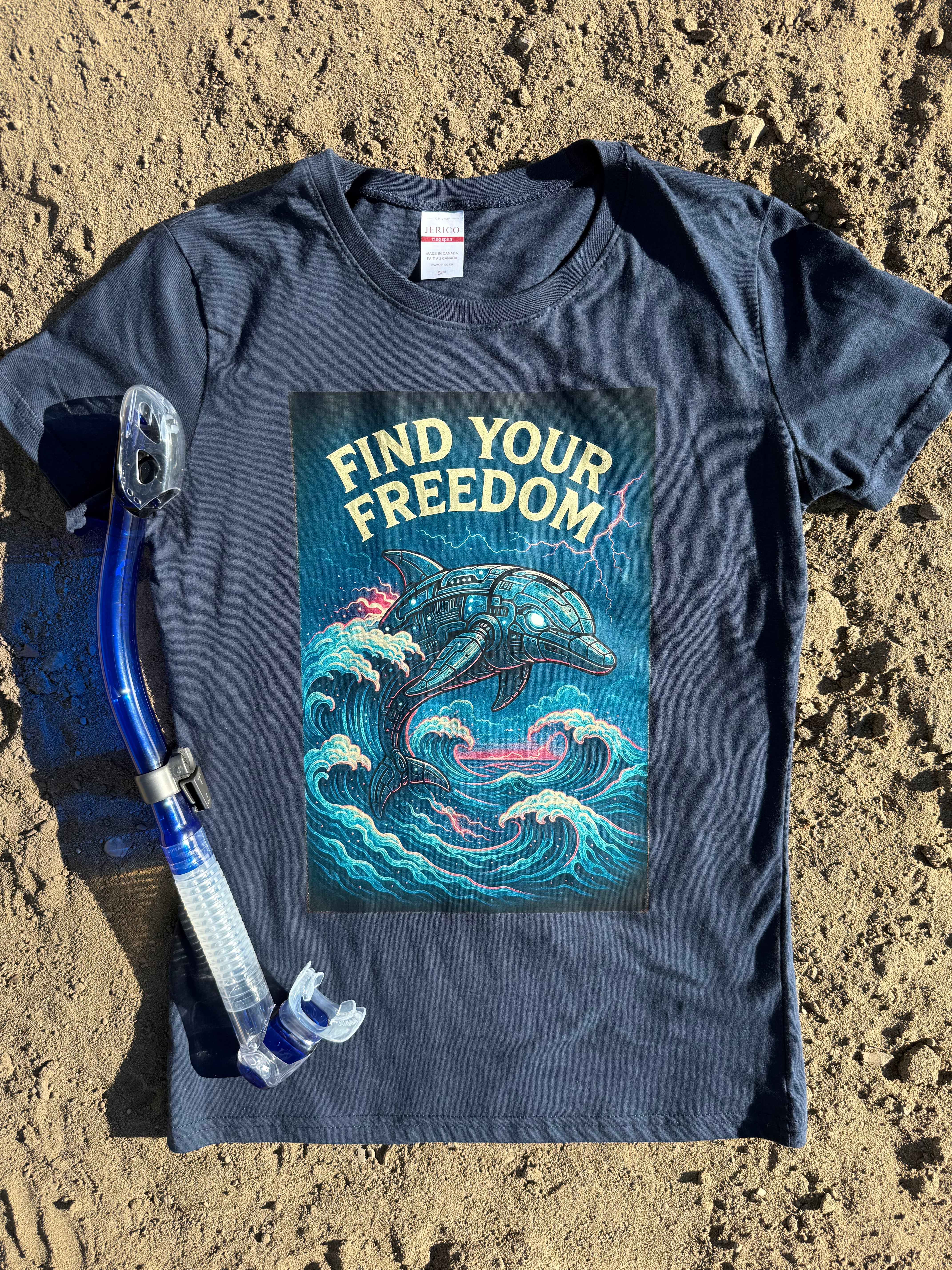 A super retro and feminine tee Find Your Freedom displaying an electrified robotic dolphin swimming in an ocean. What ocean activity brings you inner peace and bliss? Freediving, Snorkeling, Scuba diving, Surfing ?