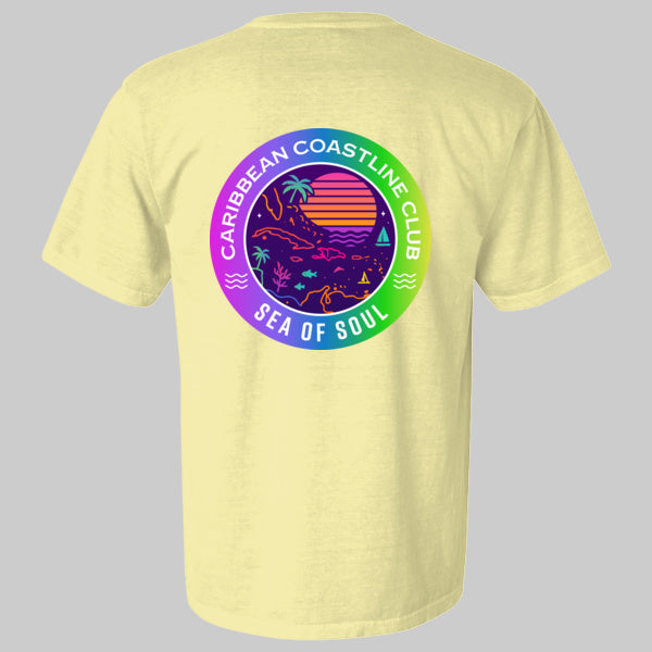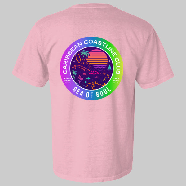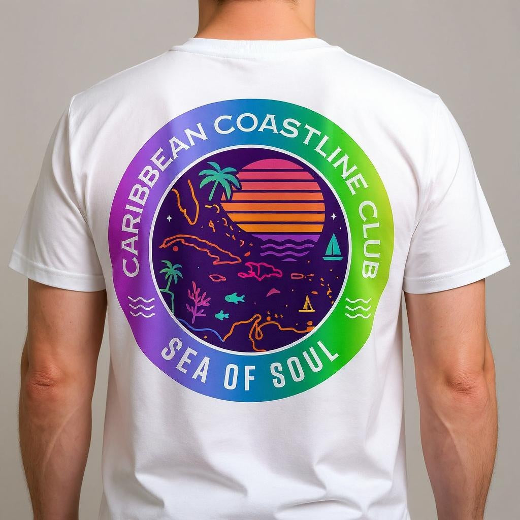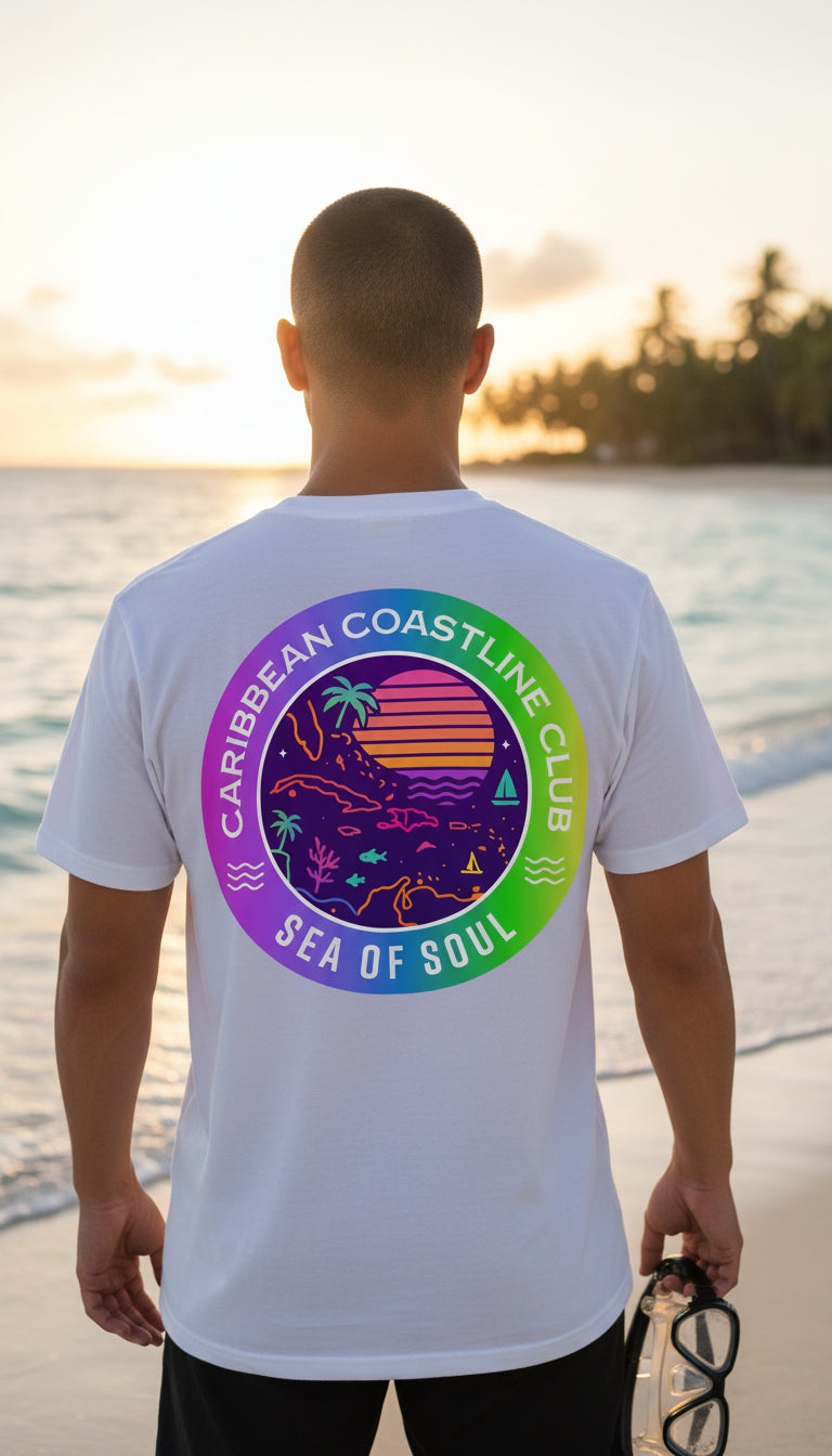 A fresh and vibrant ocean tee Caribbean Coastline Club Sea Of Soul. Dive into the Caribbean Ocean - a world famous icon of paradise - a place where electric blue water, coral kingdoms, and sun-drenched horizons collide in pure tropical magic. From the vibrant Mesoamerican Barrier Reef System teeming with life to sunset skies painted in neon colors. The Caribbean Ocean captures a feeling you can't find anywhere else: freedom, rhythm and soul carried on a warm ocean breeze. This tee is perfect for anyone who lives for ocean, sun and exploring underwater life.