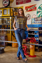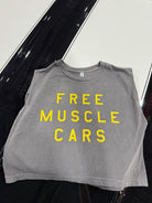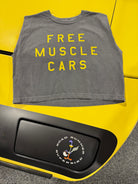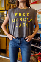 Flex your pipes and show off your guns in this retro FREE MUSCLE CARS muscle tee. This one is super vintage. Nothing cooler then a woman driving an old muscle car!