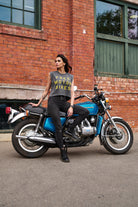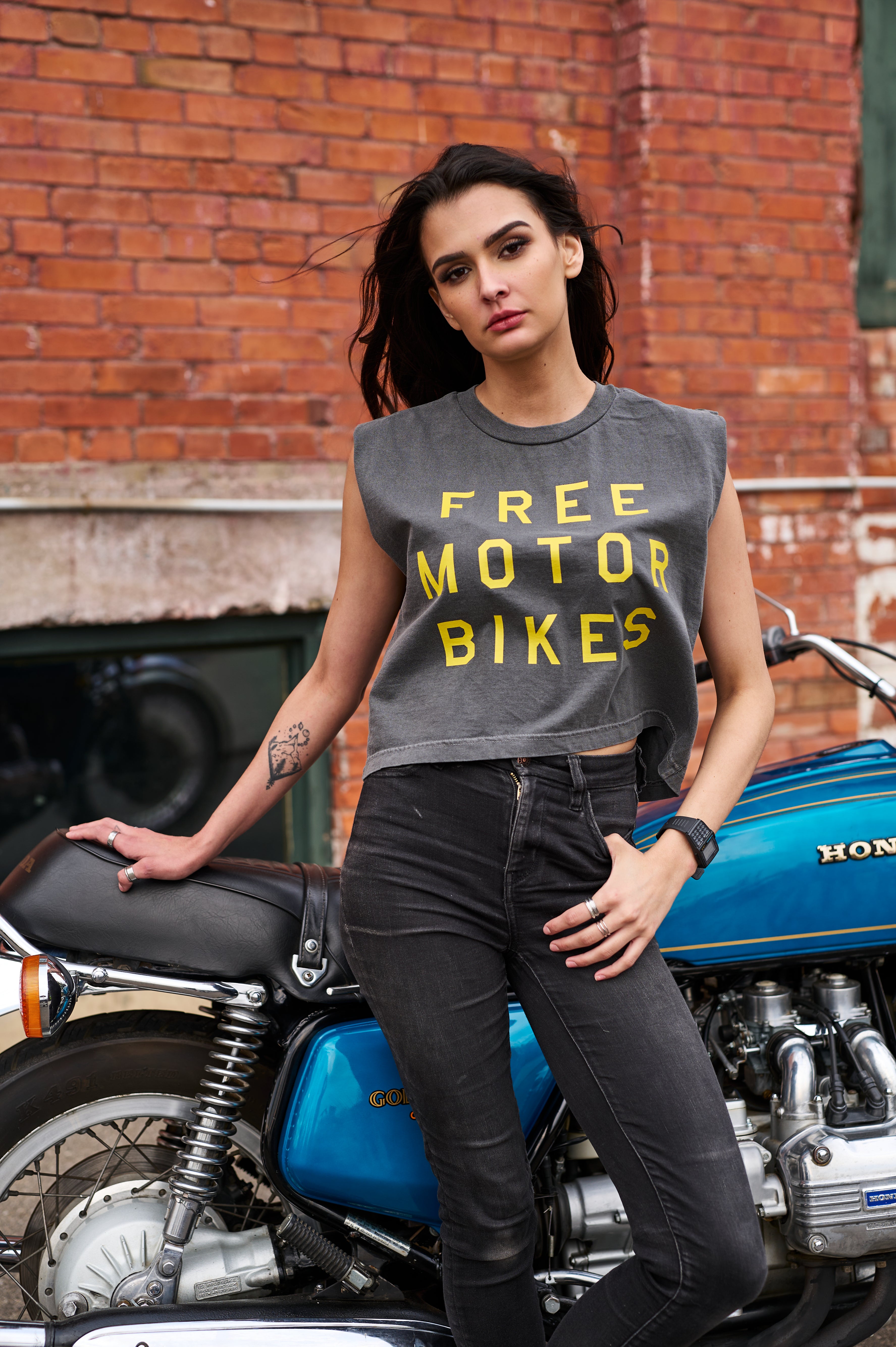 Flex your pipes and show off your guns in this retro FREE MOTOR BIKES muscle tee. This one is super vintage. Nothing cooler then a woman riding an old motorbike.