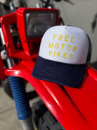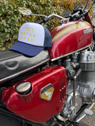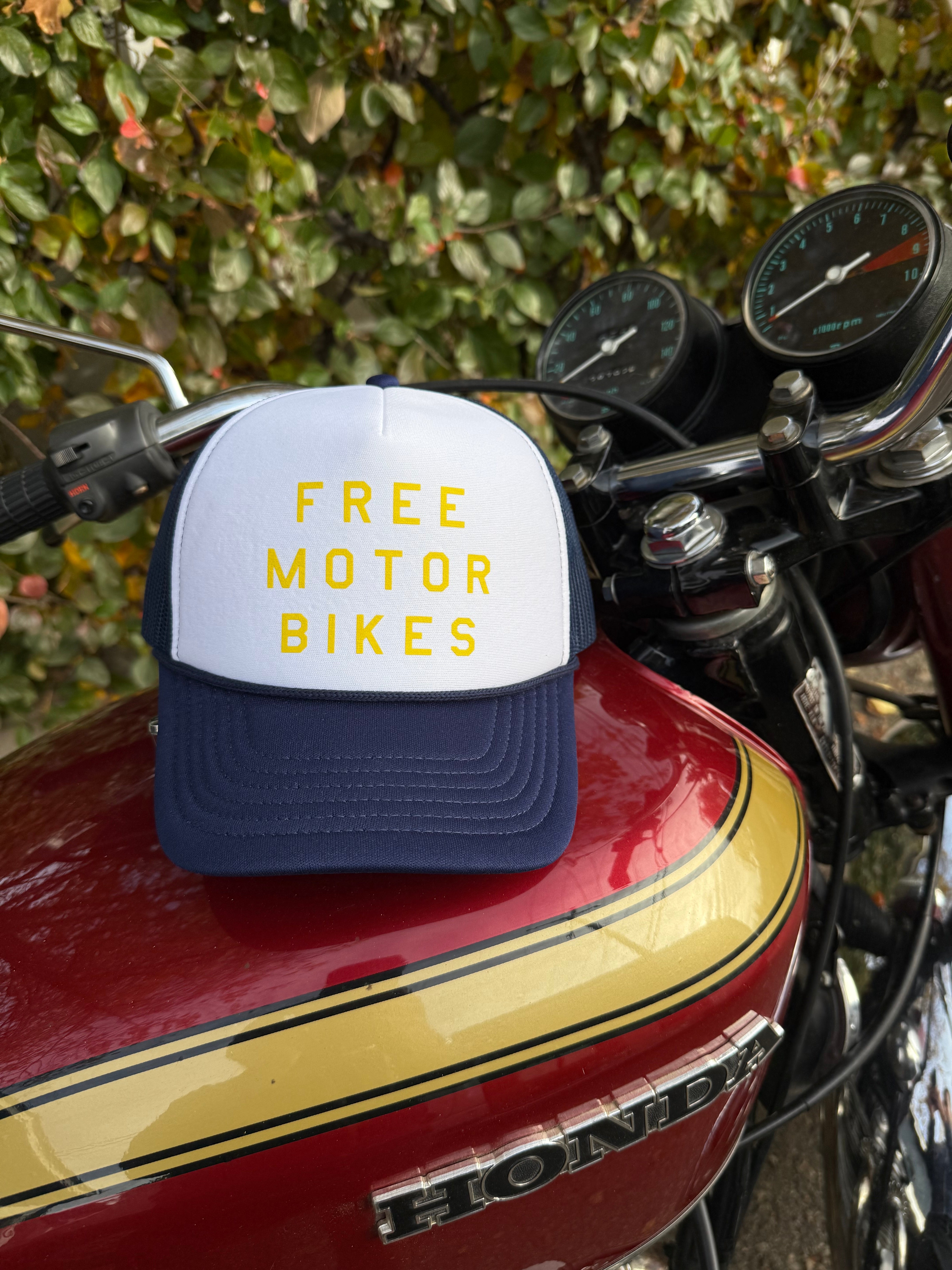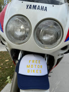 A super retro motorbike hat FREE MOTOR BIKES represents the feeling of starting up your bike and getting some well needed throttle therapy. It’s never too late to get your motorbike license and hit the open roads full throttle!