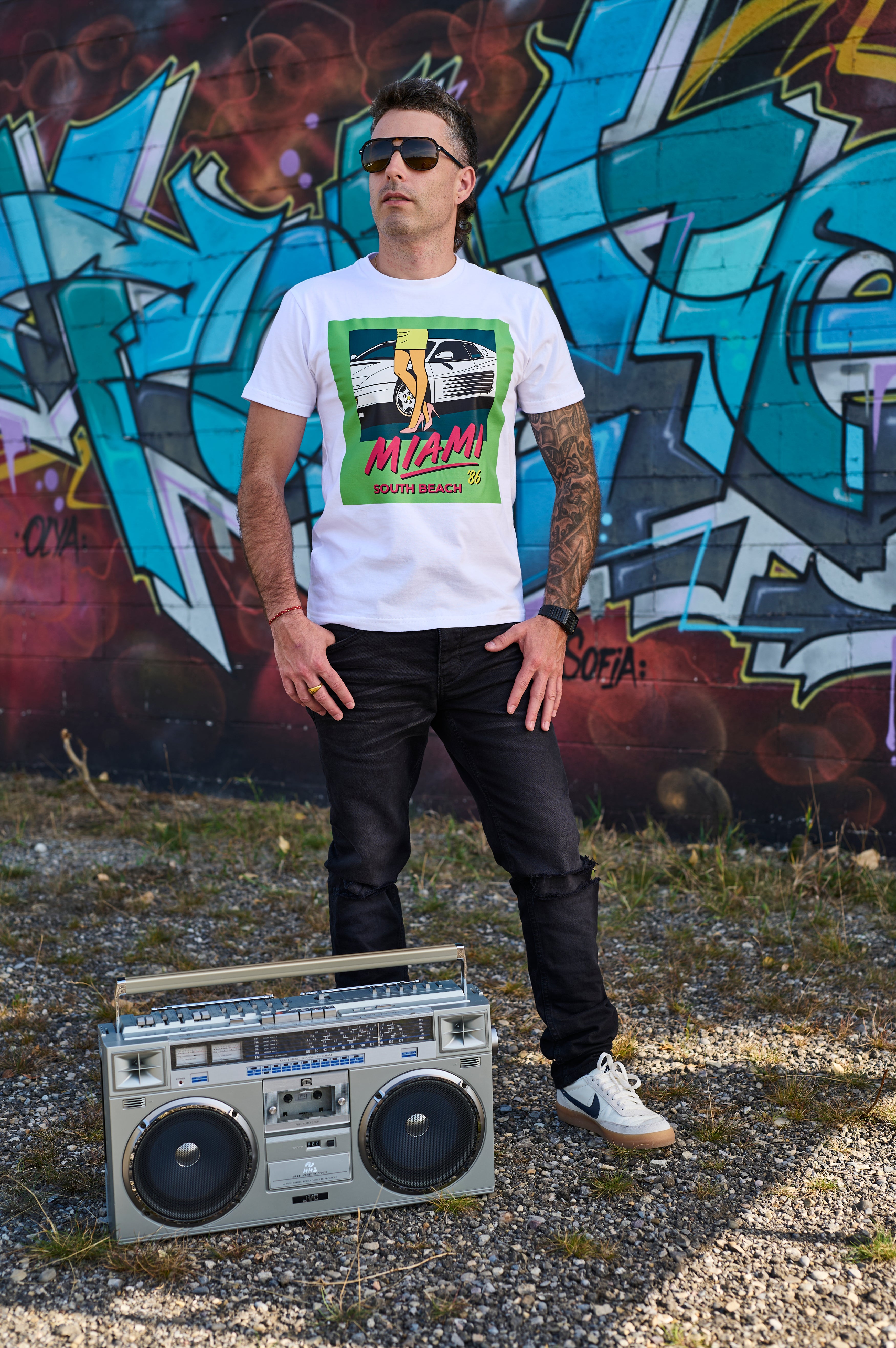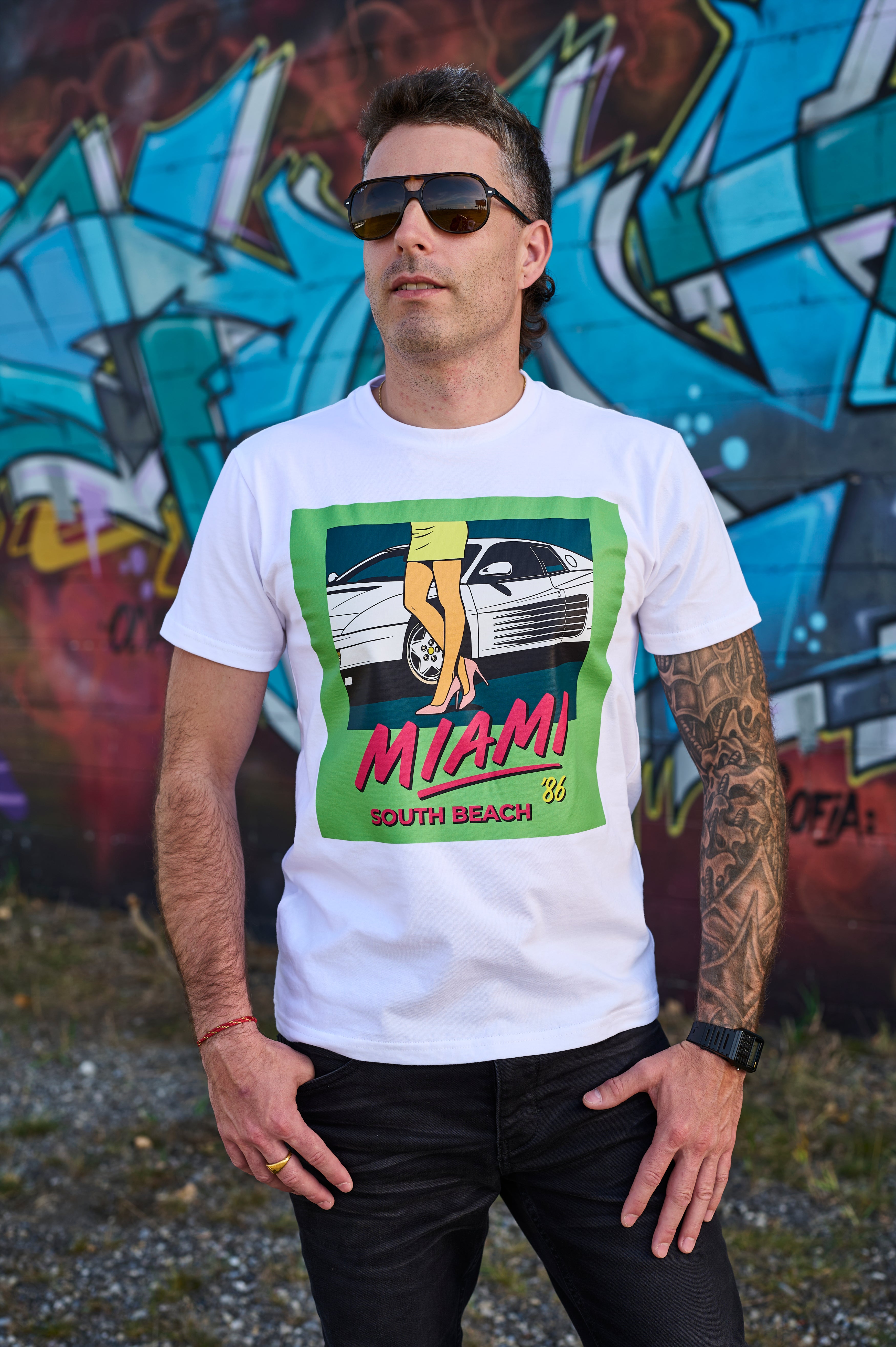 A super retro throwback tee MIAMI SOUTH BEACH '86 represents the iconic Ferrari Testarossa. This one is super 80s with its vibrant colors and Miami Vice vibes.