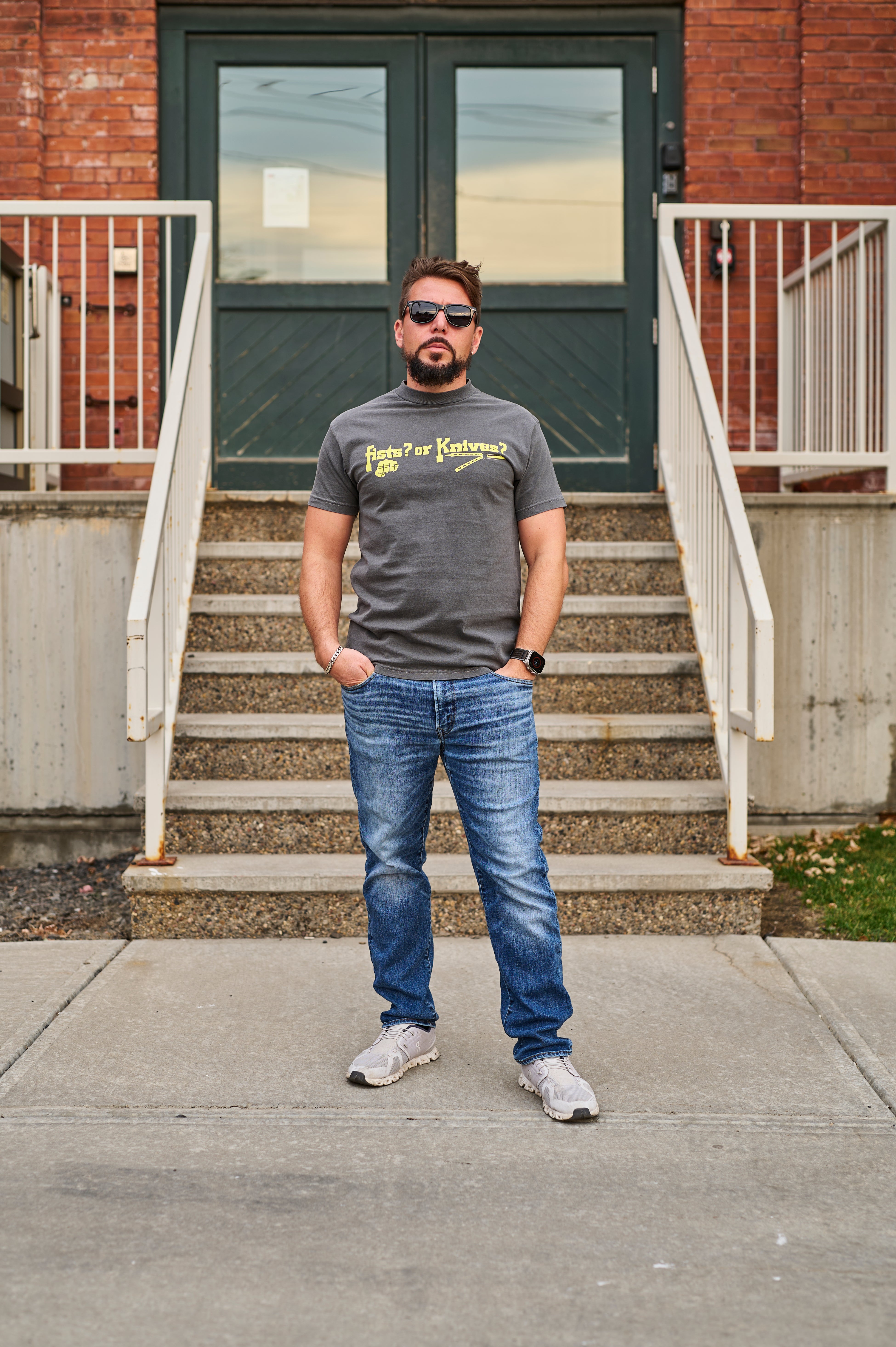 A super retro throwback tee FISTS OR KNIVES representing the 50s and 60s culture when greasers would battle the jocks over women and turf. James Dean, Marlon Brando, Clint Eastwood and The Fonz were some of the OGs when it came to being cool.